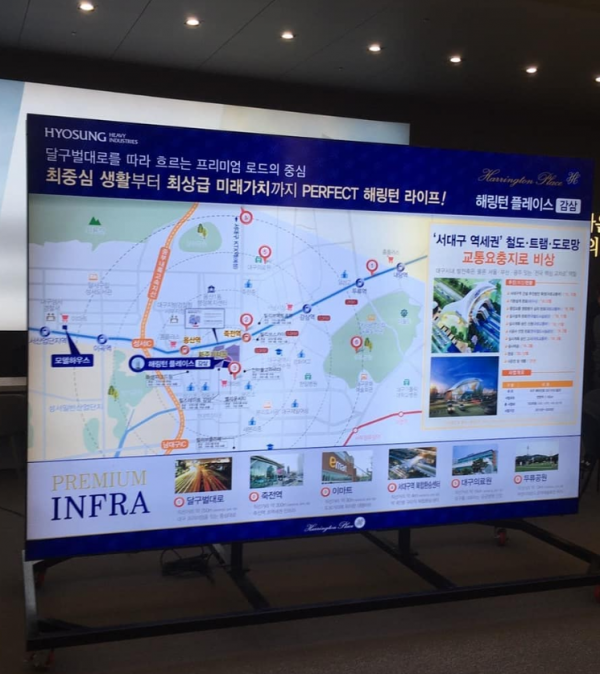 해링턴 플레이스 감삼 모델하우스에 조명용 광고 이동식 사인탑 간판 제작, 설치